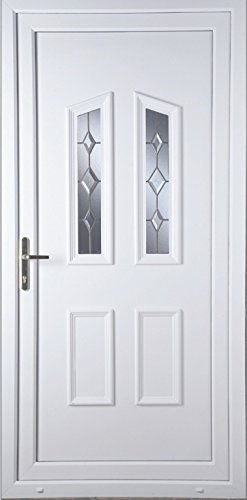 PRODUCT DESCRIPTIONS:Bermuda Star Cut Bevel uPVC Door, 840mm x 2085mm. Door Opens Inwards. Hinged On The Right. Sill Supplied With Door & amp; Supplied Pre Hung. Chrome Letterplate. Door Specification: High quality 70mm grade 'A' Virgin Polymer, which is UV stabilised. White both sides. 28mm uPVC stabilised panel to protect against discolouration. Internally beaded. Toughened frosted safety glass. 3 high quality butt hinges. 6 point locking system. Lock cylinder with 3 keys. Lever/Lever high security handle configuration in Chrome. (Toplights, Sidelights or Flag Windows are available upon request)