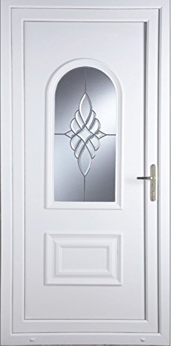 PRODUCT DESCRIPTIONS:Cain Bevel Cluster uPVC Door, 920mm x 2085mm. Door Opens Inwards. Hinged On The Left. Sill Supplied With Door & amp; Supplied Pre Hung. Chrome Letterplate. Door Specification: High quality 70mm grade 'A' Virgin Polymer, which is UV stabilised. White both sides. 28mm uPVC stabilised panel to protect against discolouration. Internally beaded. Toughened frosted safety glass. 3 high quality butt hinges. 6 point locking system. Lock cylinder with 3 keys. Lever/Lever high security handle configuration in Chrome. (Toplights, Sidelights or Flag Windows are available upon request)