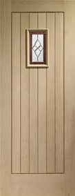 PRODUCT DESCRIPTIONS:A glazed Oak Triple Glazed door in the External Door Range. A boarded door design for maximum stability, with a small triple glazed water glass design surrounded with brass caming. This door has a Certified U Value of 2.9W/m²K when installed as part of