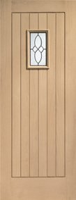 PRODUCT DESCRIPTIONS:A glazed Oak Triple Glazed door in the External Door Range. A boarded door design for maximum stability, with a small triple glazed water glass design surrounded with brass caming. This door has a Certified U Value of 2.9W/m²K when installed as part of