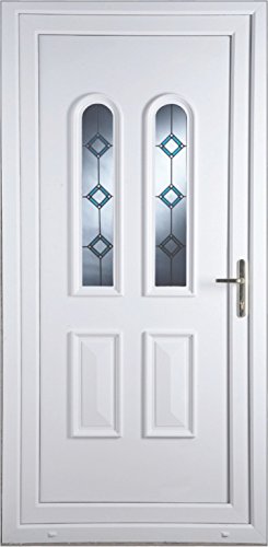 PRODUCT DESCRIPTIONS:Leah Blue Border uPVC Door, 920mm x 2085mm. Door Opens Inwards. Hinged On The Left. Sill Supplied With Door & amp; Supplied Pre Hung. Chrome Letterplate. Door Specification: High quality 70mm grade 'A' Virgin Polymer, which is UV stabilised. White both sides. 28mm uPVC stabilised panel to protect against discolouration. Internally beaded. Toughened frosted safety glass. 3 high quality butt hinges. 6 point locking system. Lock cylinder with 3 keys. Lever/Lever high security handle configuration in Chrome. (Toplights, Sidelights or Flag Windows are available upon request)