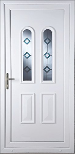 PRODUCT DESCRIPTIONS:Leah Blue Border uPVC Door, 840mm x 2085mm.Door Opens Inwards. Hinged On The Right. Sill Supplied With Door & amp; Supplied Pre Hung. Chrome Letterplate. Door Specification: High quality 70mm grade 'A' Virgin Polymer, which is UV stabilised. White both sides. 28mm uPVC stabilised panel to protect against discolouration. Internally beaded. Toughened frosted safety glass. 3 high quality butt hinges. 6 point locking system. Lock cylinder with 3 keys. Lever/Lever high security handle configuration in Chrome. (Toplights, Sidelights or Flag Windows are available upon request)
