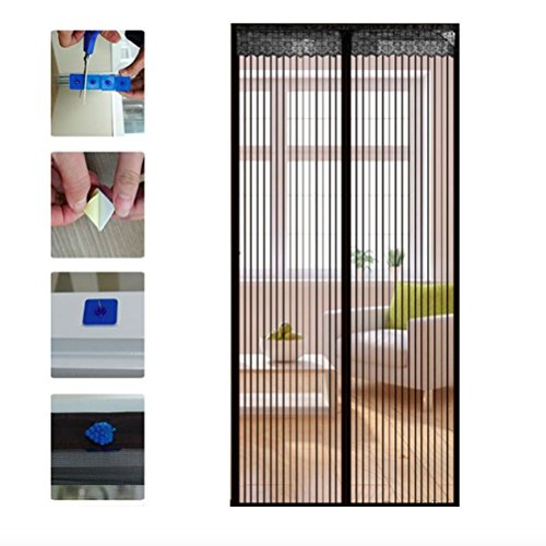 PRODUCT DESCRIPTIONS:DescriptionThis item is made of soft magnetic stripe and polyester. It is a self-closing screen door for household. It keeps insects and other critters out of your house. You can use it for kitchen, dining room, parlour, garage, bedroom, etc. It is easy to assemble and quite durable. A fabulous household necessity for your family.Features- Color: Black.- Material: Magnetic stripe andamp; Polyester.- Size: 90 * 210cm(W * H).- Suitable for kitchen, dining room, parlour, garage, bedroom, etc.- Allows fresh air to circulate into your home while keeping insects and other critters out.- Helps your house stay cool when its hot.- Fits single doors, sliding doors and camper doors.- Self-closing free your hands.- A fabulous household necessity for your family.- Pls note that the pushpin can only be used for wooden doorframe.Package Including1 * 90*210cm Magnetic Mesh Screen Door Self-closing Curtain for Household Anti-insects (Black)